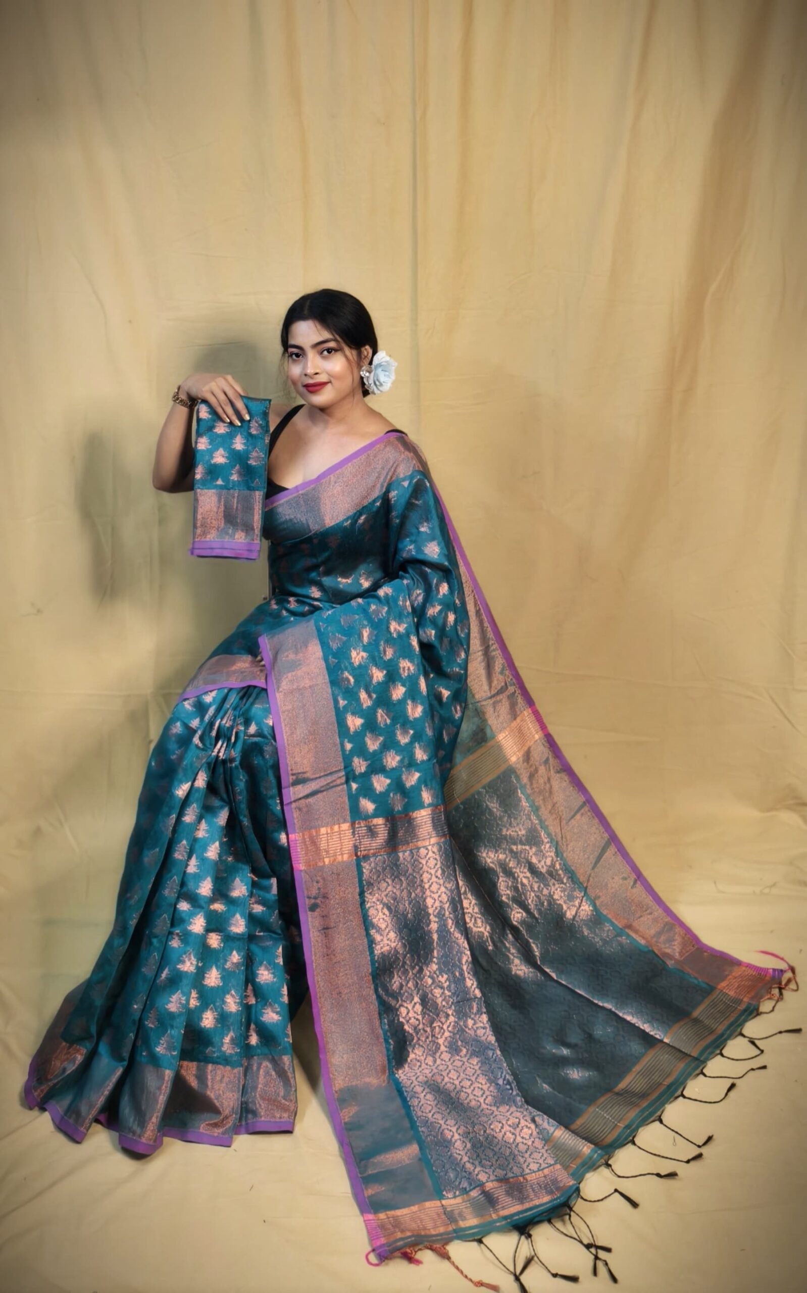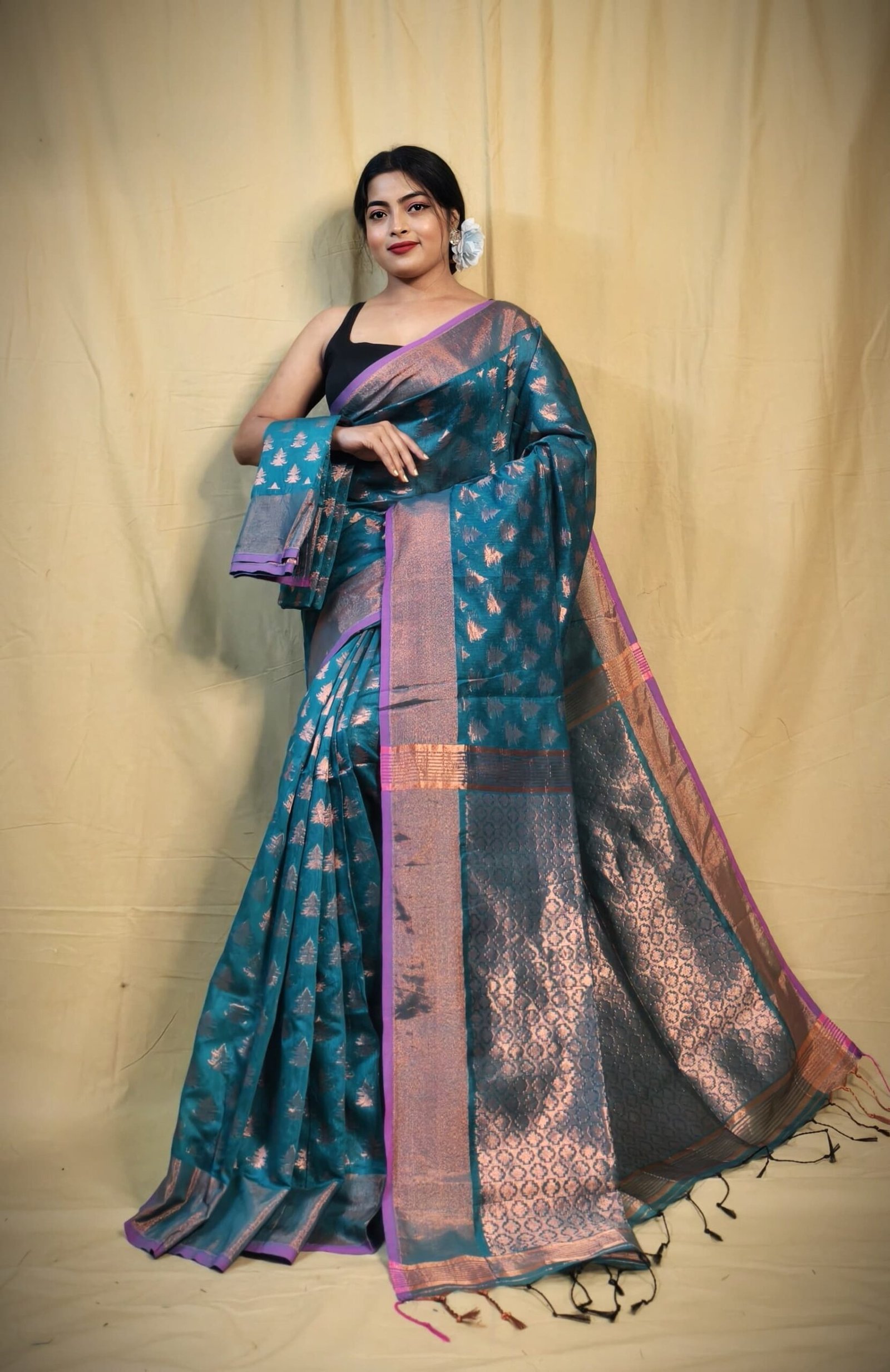 The border is beautifully finished with a delicate weave, complemented by tassel detailing at the end for added charm. Made from a premium blend of cotton and silk, this saree offers both softness and a subtle sheen, ensuring comfort with sophistication. Perfect for weddings, festivals, or grand celebrations, it comes with a matching blouse piece to complete the traditional ensemble. A timeless choice for the modern woman who appreciates heritage artistry.