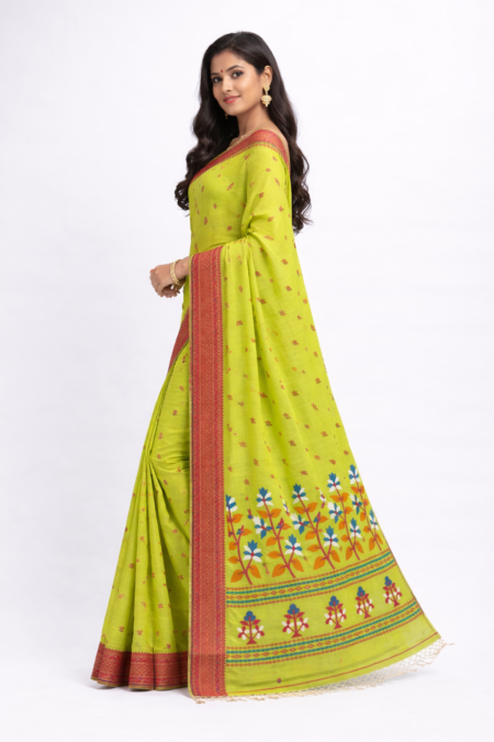 The border is beautifully finished with a delicate weave, complemented by tassel detailing at the end for added charm. Made from a premium blend of cotton and silk, this saree offers both softness and a subtle sheen, ensuring comfort with sophistication. Perfect for weddings, festivals, or grand celebrations, it comes with a matching blouse piece to complete the traditional ensemble. A timeless choice for the modern woman who appreciates heritage artistry.