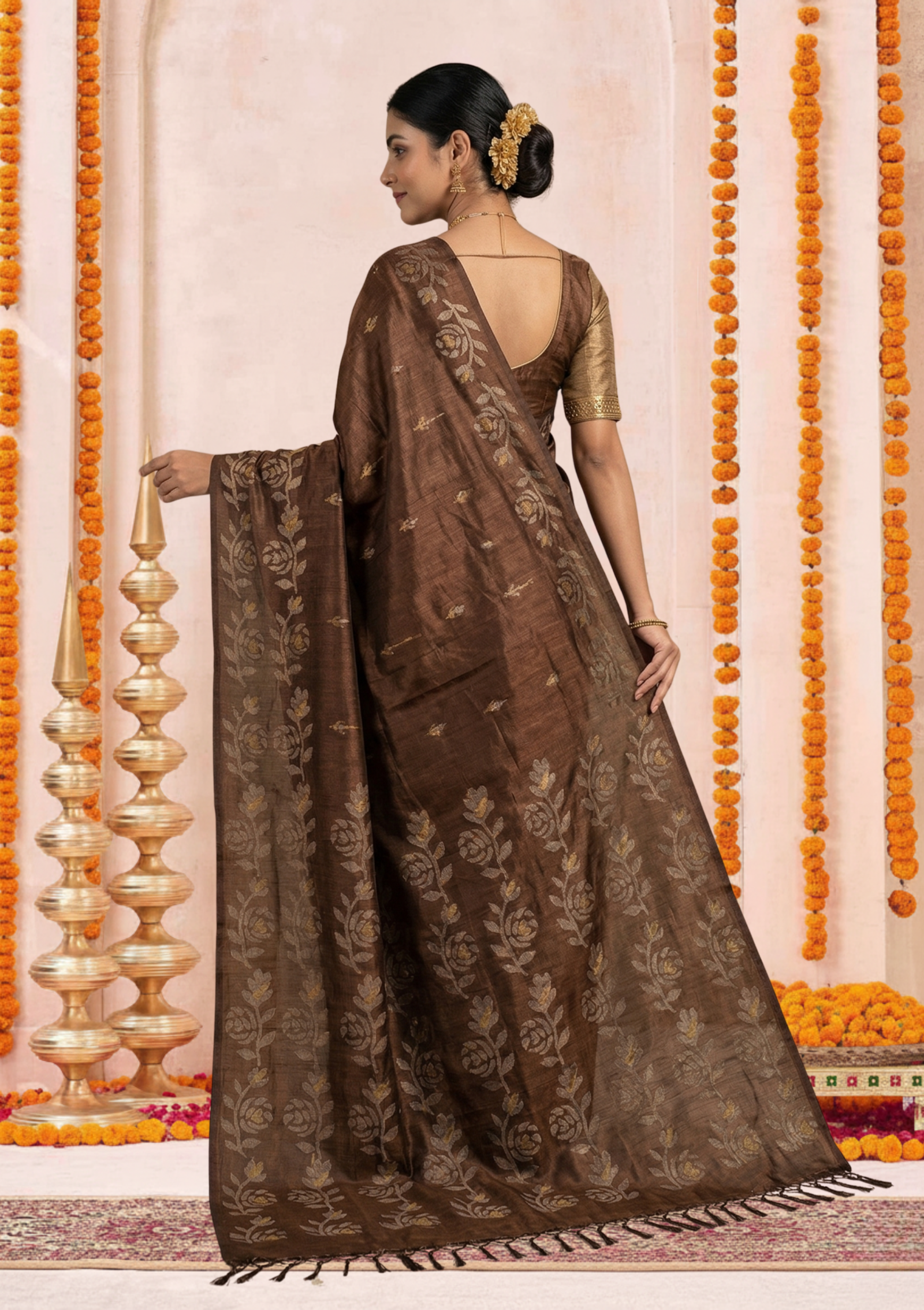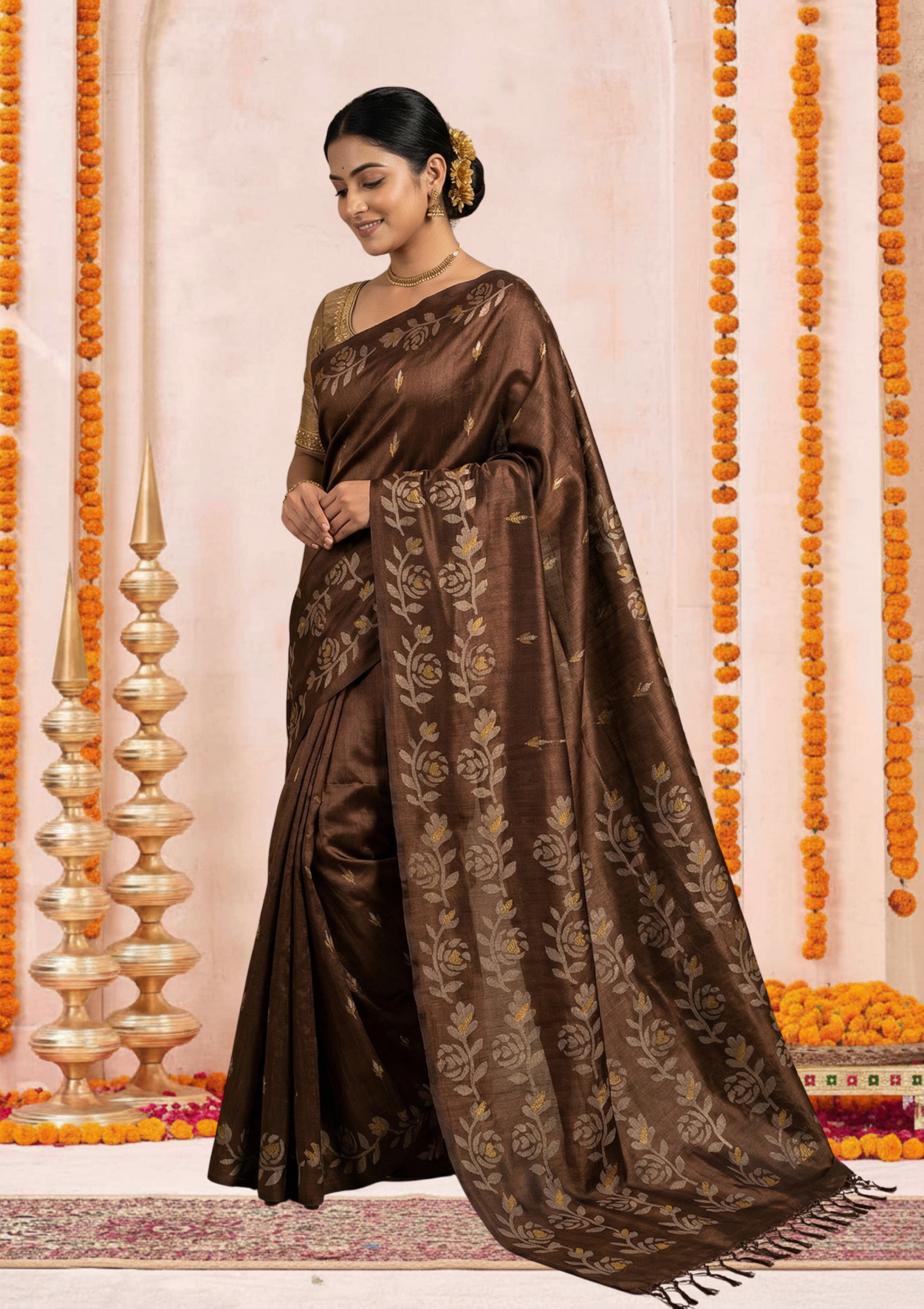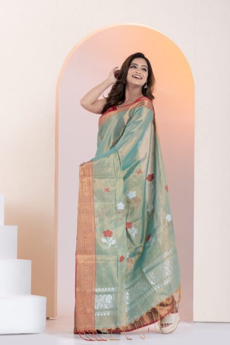 This Tussar silk saree is a beautiful blend of traditional craftsmanship and contemporary floral aesthetics. Known for its rich texture and natural sheen, this piece is an elegant choice for both formal gatherings and festive celebrations.