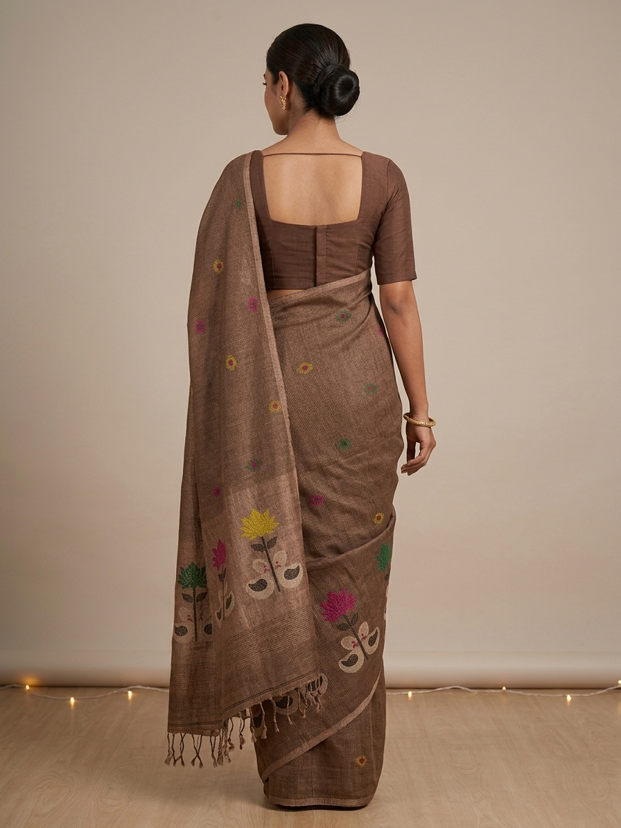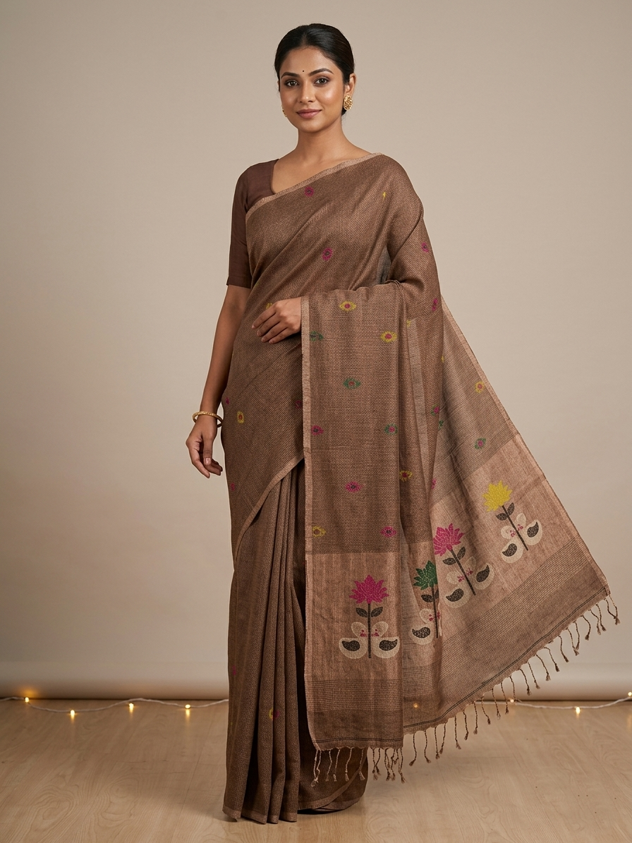 A graceful fusion of traditional craftsmanship and contemporary elegance, this linen silk handloom saree features delicate all-over buti motifs complemented by a beautifully woven floral border. The artisanal weaving highlights fine texture, while the pallu is enhanced with intricate floral patterns and finished with classic tassels, adding a refined touch to the drape. Perfect for both casual sophistication and festive charm.