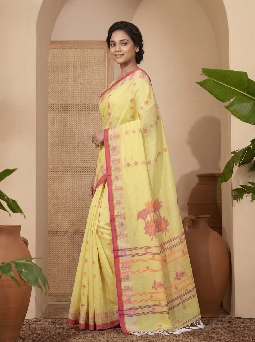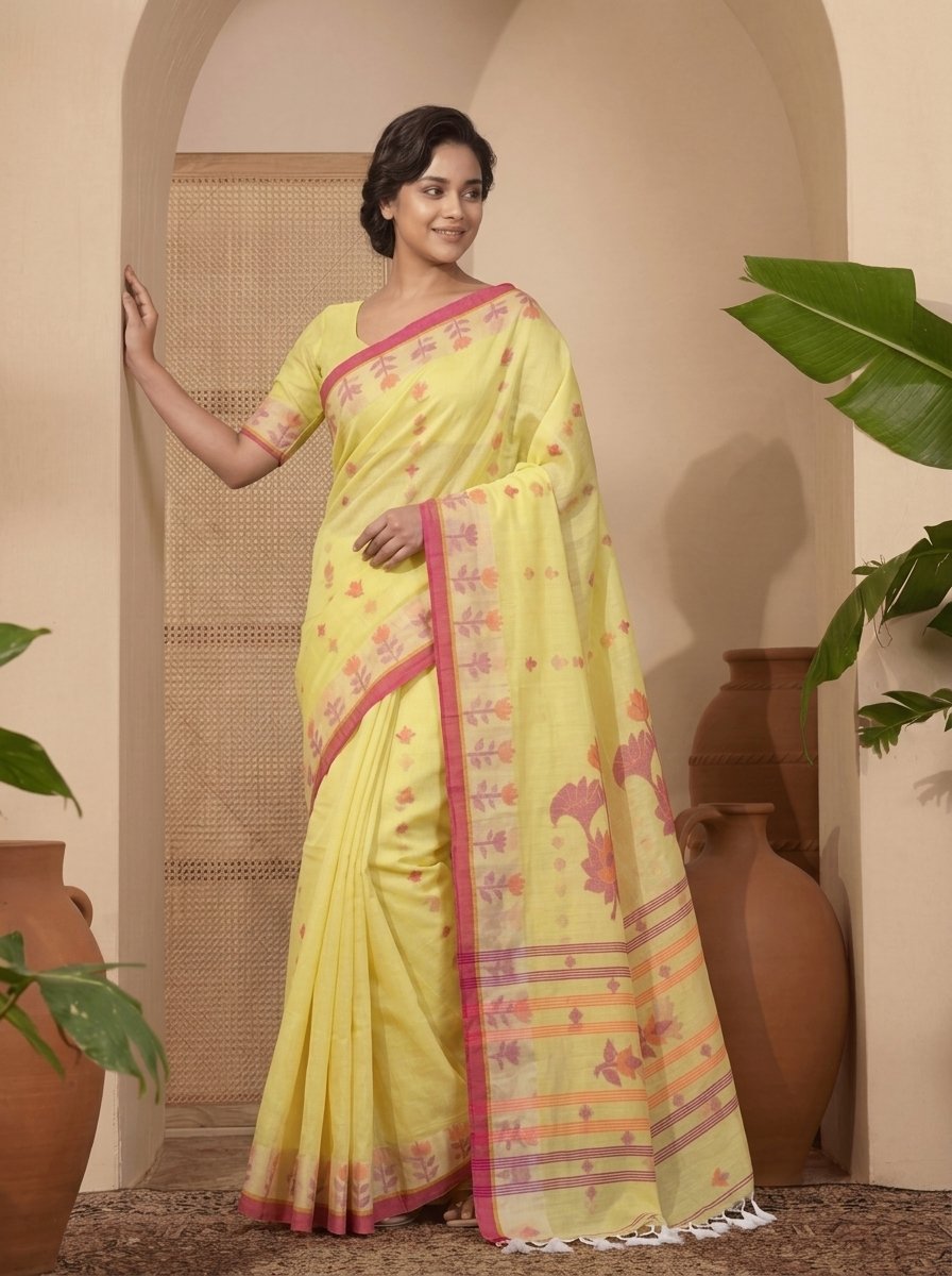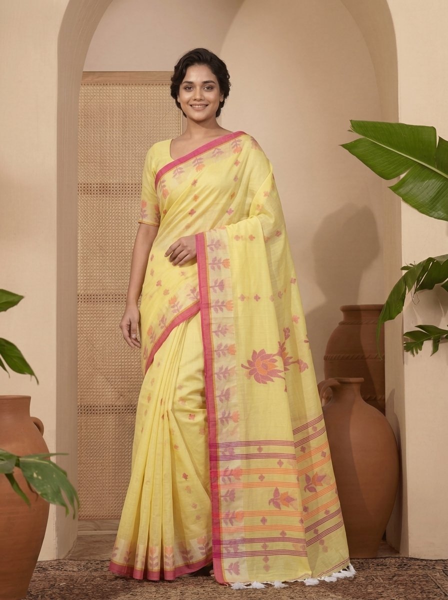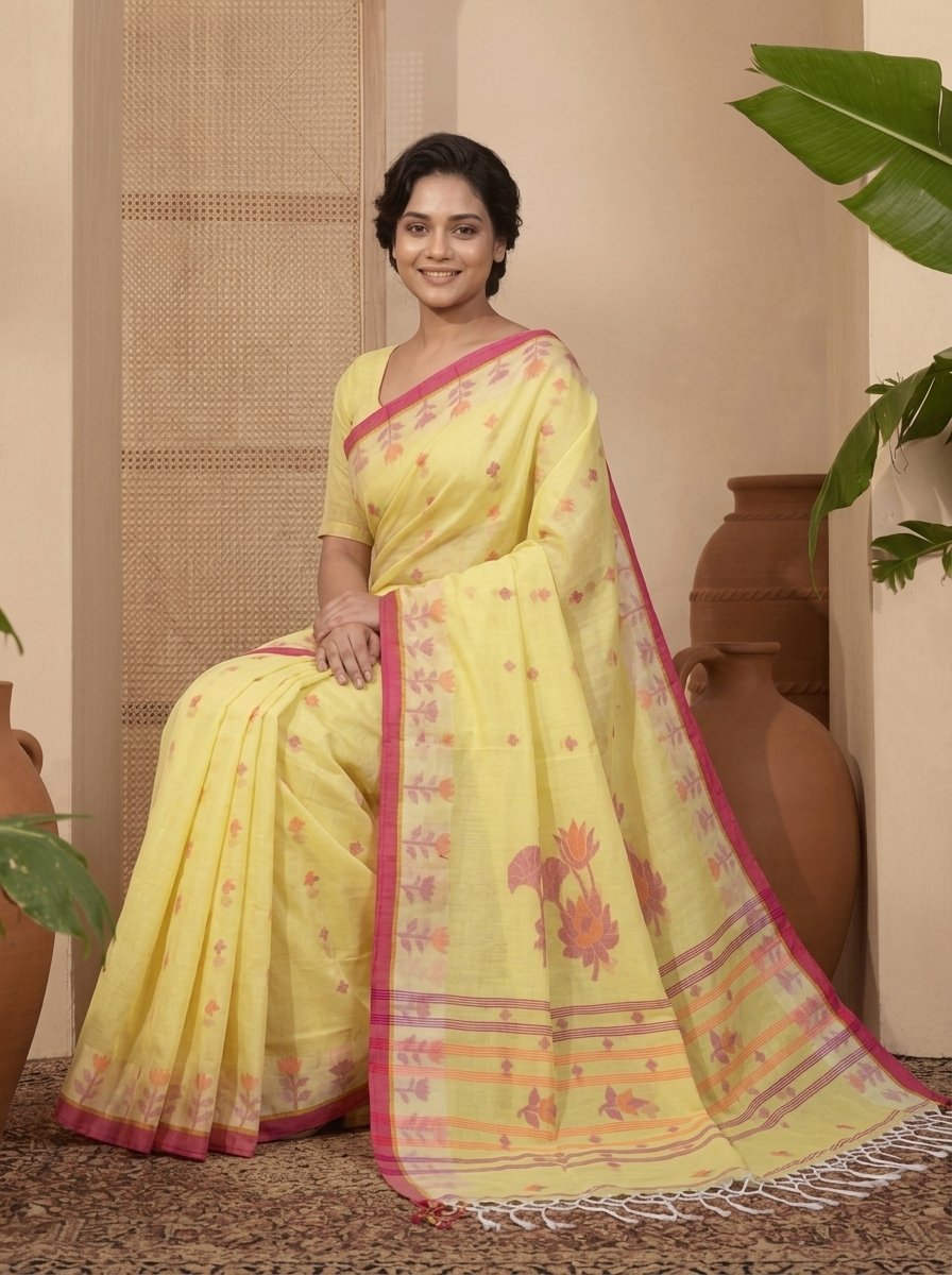 Handloom Cotton Jamdani Saree with Woven Floral Motifs