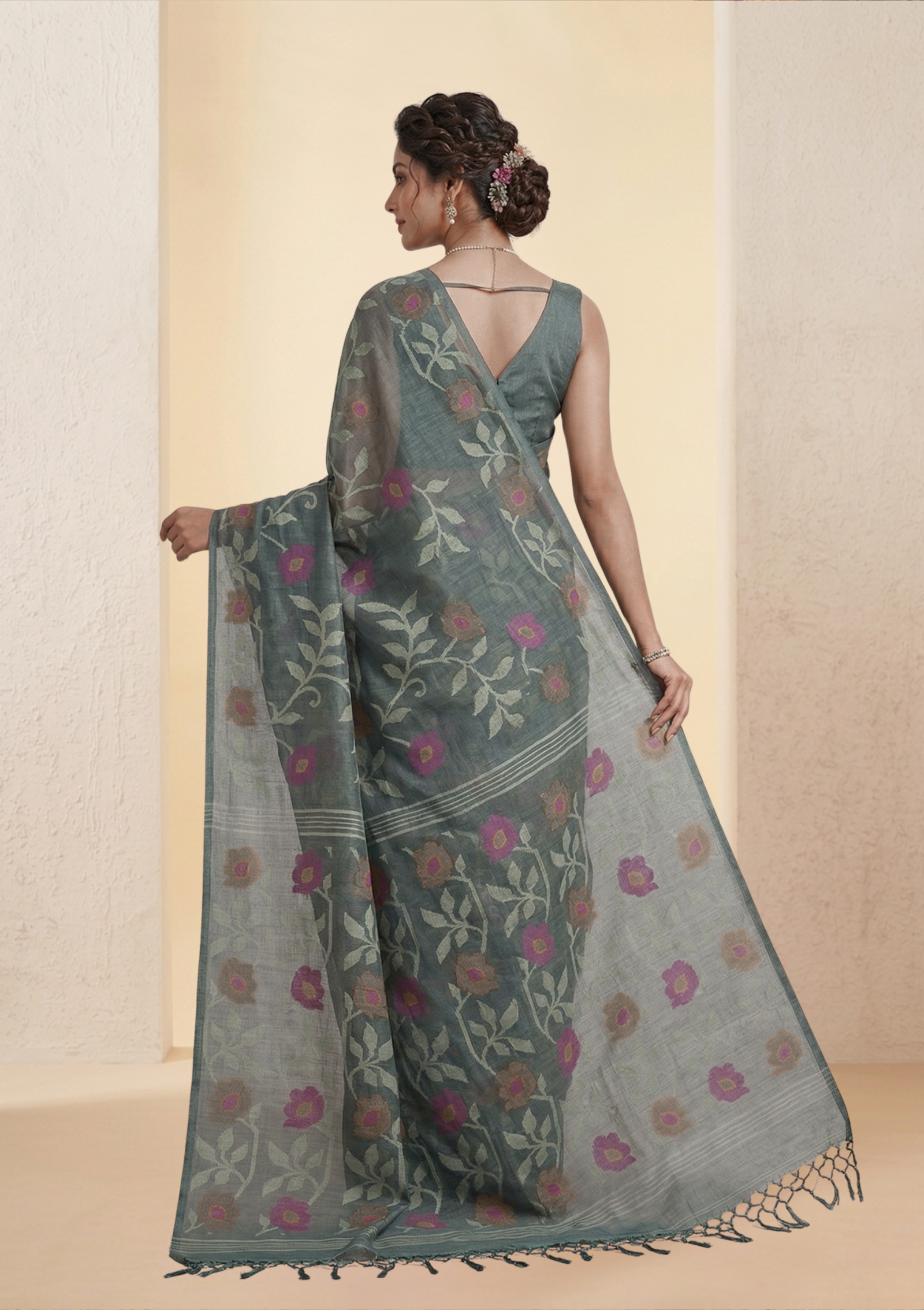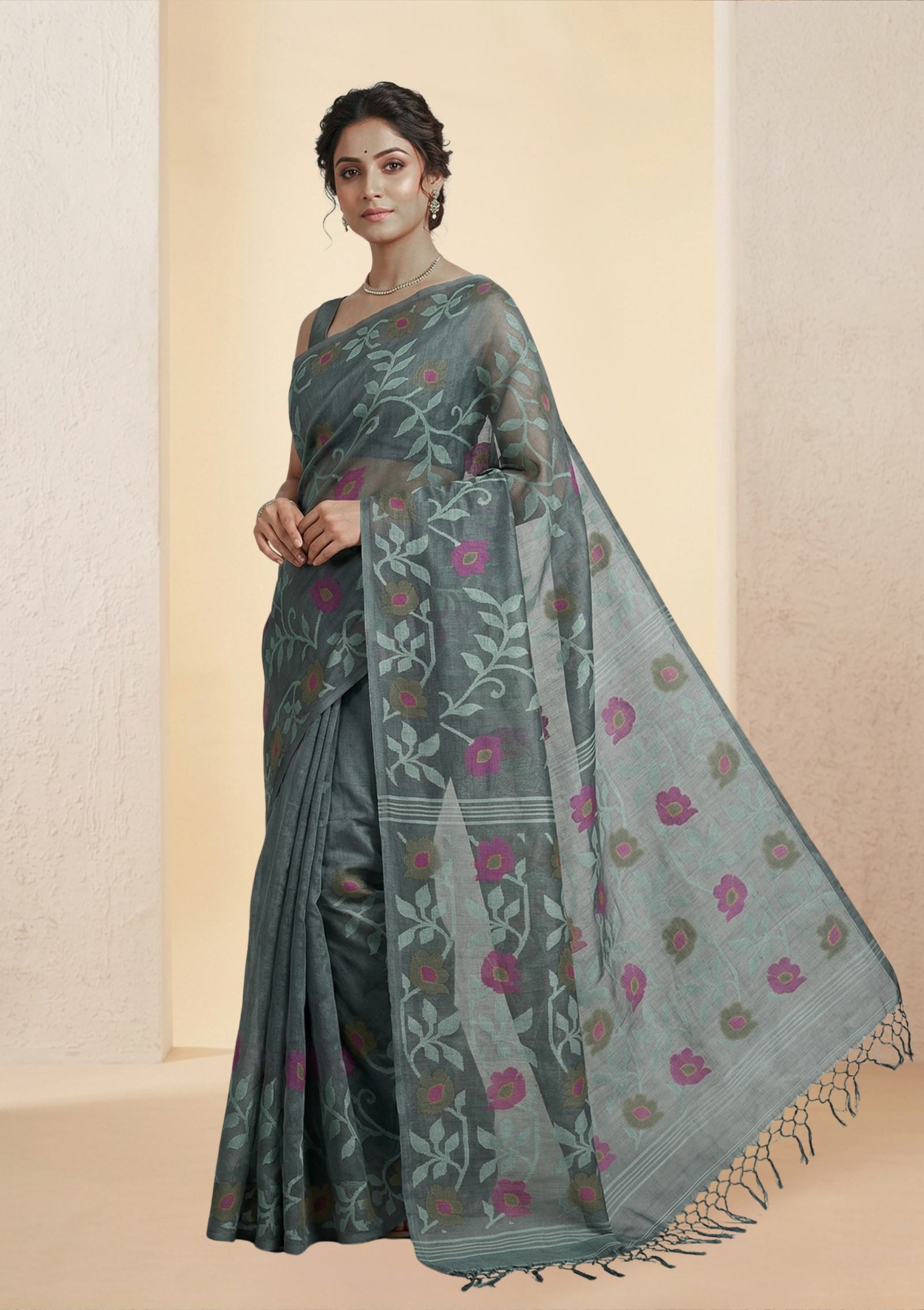 Premium Tussar Saree with Floral Jamdani Weave