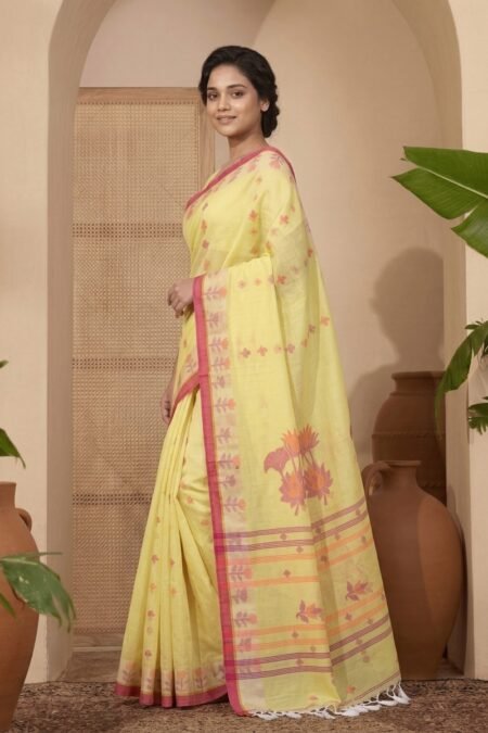 The saree is detailed with a structured woven border that adds depth and definition, while the pallu features clean, linear accents that enhance its minimalist appeal. The finish is soft and fluid, ensuring ease of draping and all-day comfort. Subtle tassel detailing at the end adds a touch of artisanal charm.