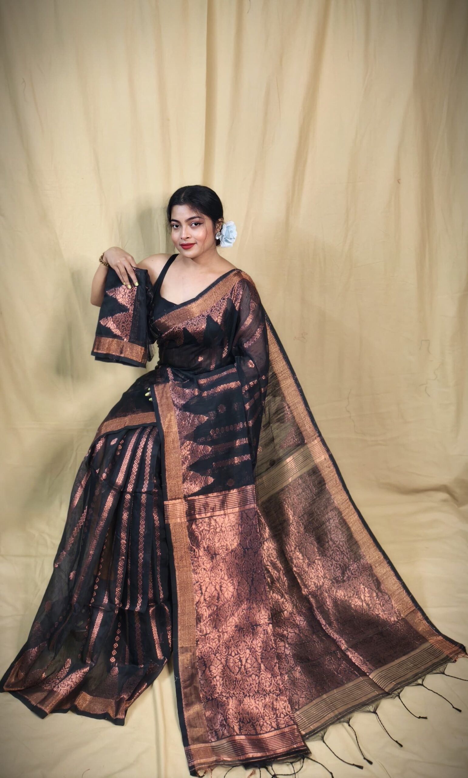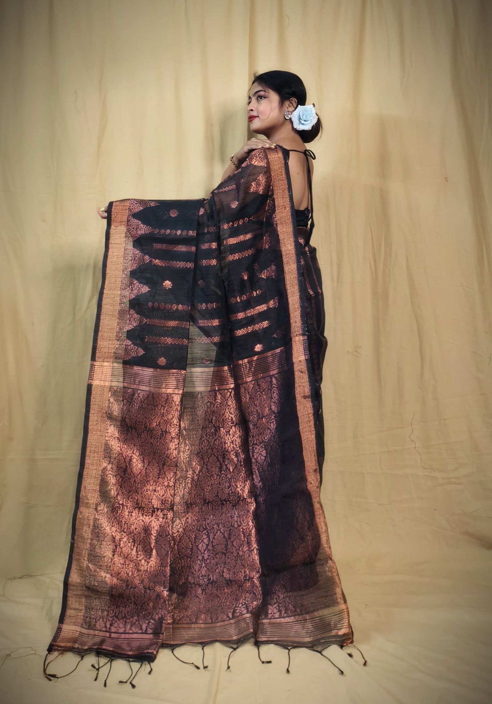 The border is beautifully finished with a delicate weave, complemented by tassel detailing at the end for added charm. Made from a premium blend of cotton and silk, this saree offers both softness and a subtle sheen, ensuring comfort with sophistication. Perfect for weddings, festivals, or grand celebrations, it comes with a matching blouse piece to complete the traditional ensemble. A timeless choice for the modern woman who appreciates heritage artistry.
