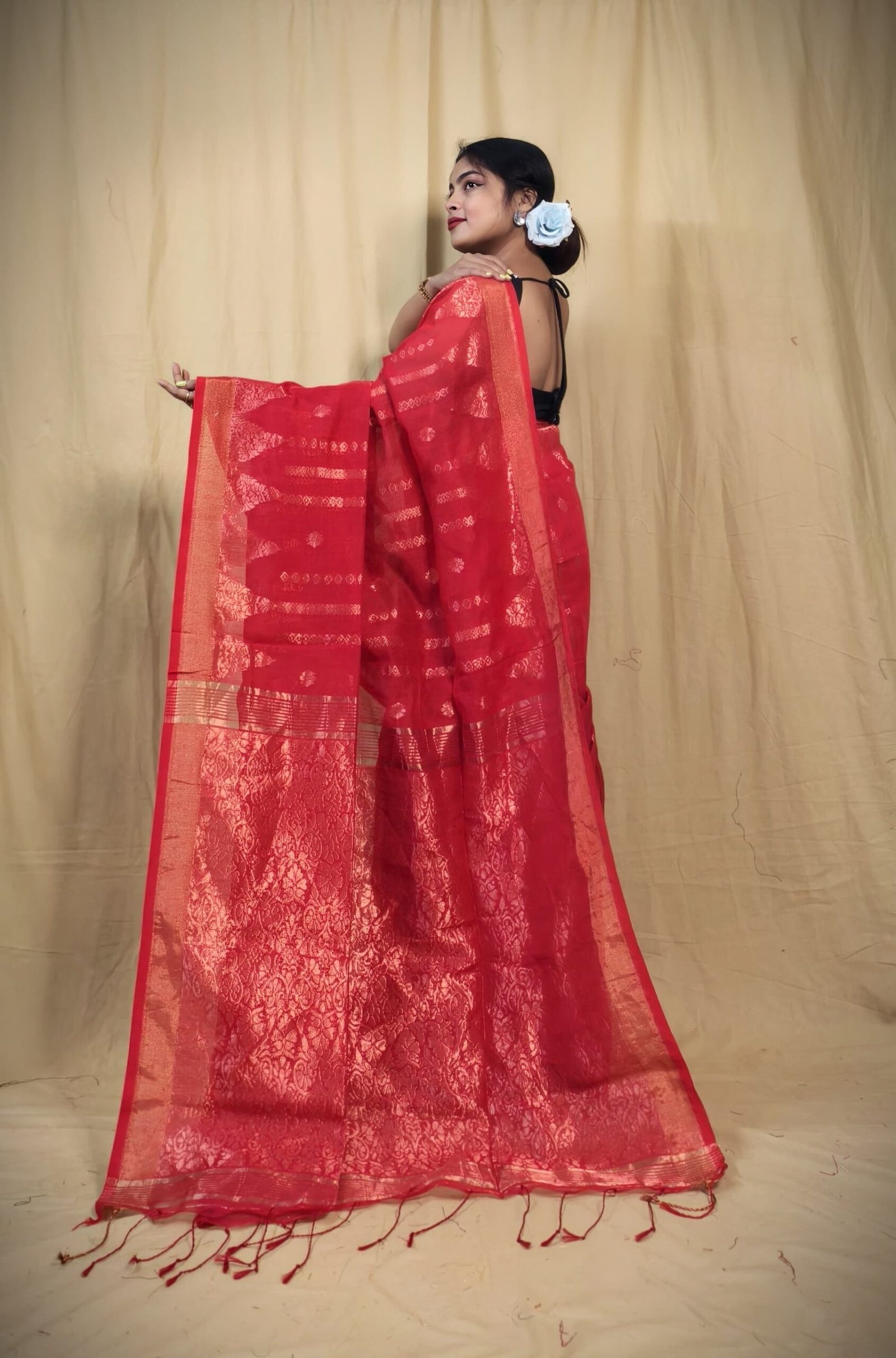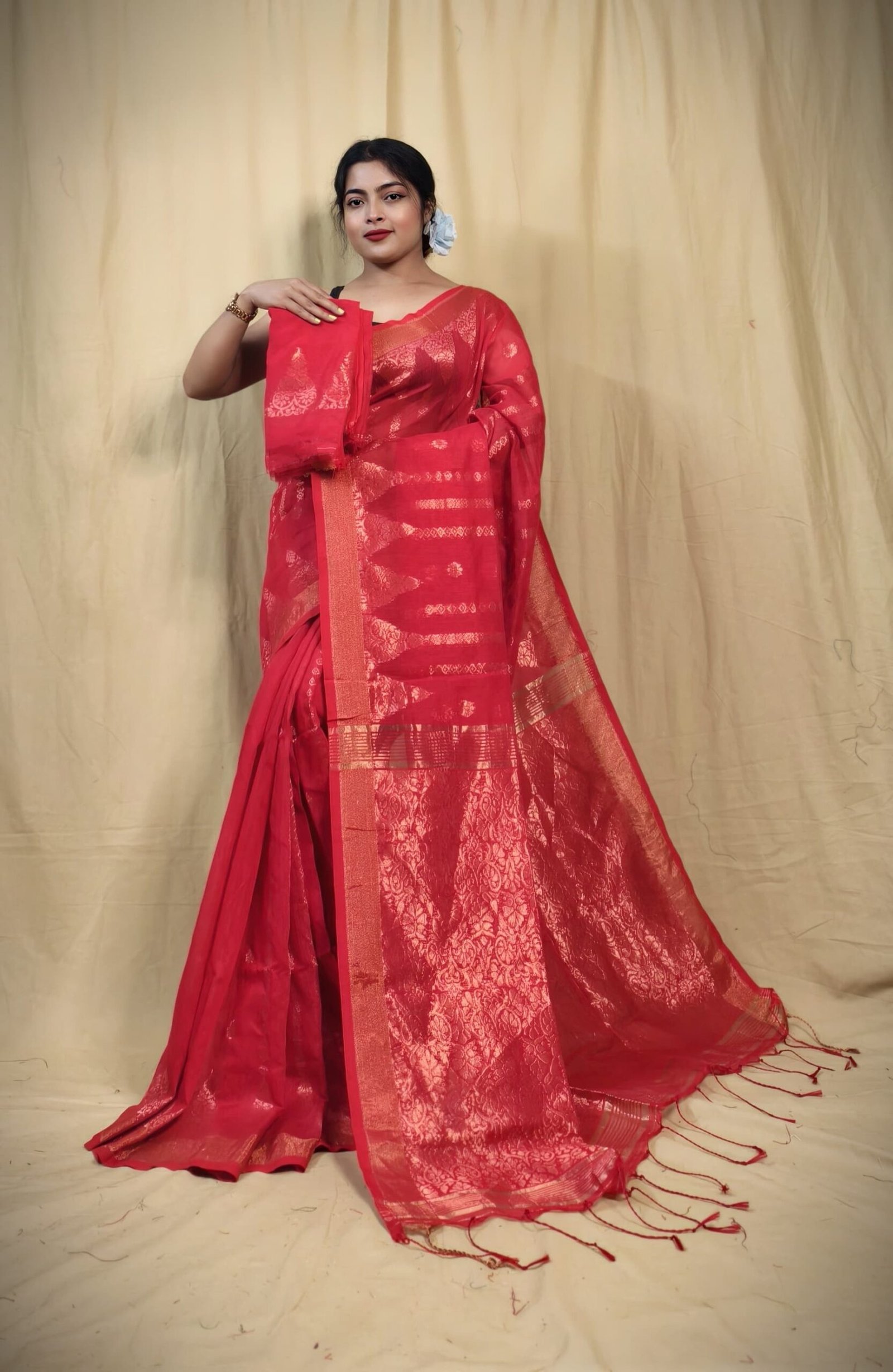 The border is beautifully finished with a delicate weave, complemented by tassel detailing at the end for added charm. Made from a premium blend of cotton and silk, this saree offers both softness and a subtle sheen, ensuring comfort with sophistication. Perfect for weddings, festivals, or grand celebrations, it comes with a matching blouse piece to complete the traditional ensemble. A timeless choice for the modern woman who appreciates heritage artistry.
