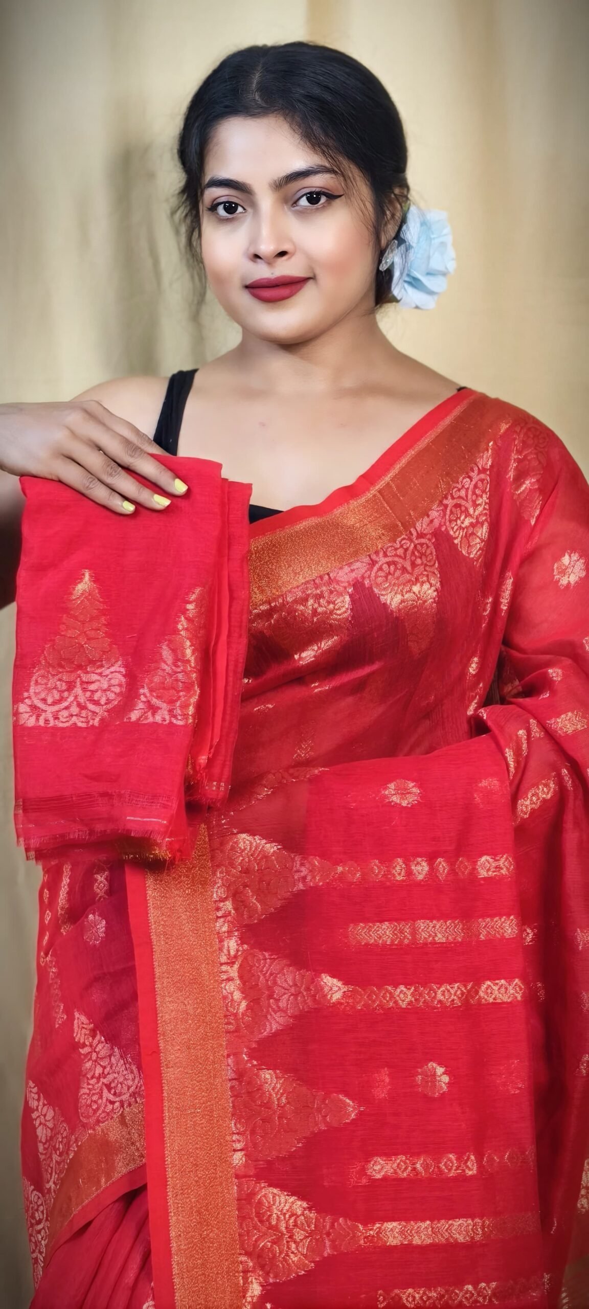 Banarasi Design Allover Handloom Zari Work Cotton Silk Saree. This elegant saree is crafted using traditional handloom techniques, showcasing the richness of Banarasi weaving. The saree features intricate allover zari work in classic motifs that exude opulence and grace. The body is adorned with finely woven patterns that add depth and dimension to the fabric, while the pallu is lavishly designed with detailed zari craftsmanship, making it a statement piece for festive and cultural occasions.
