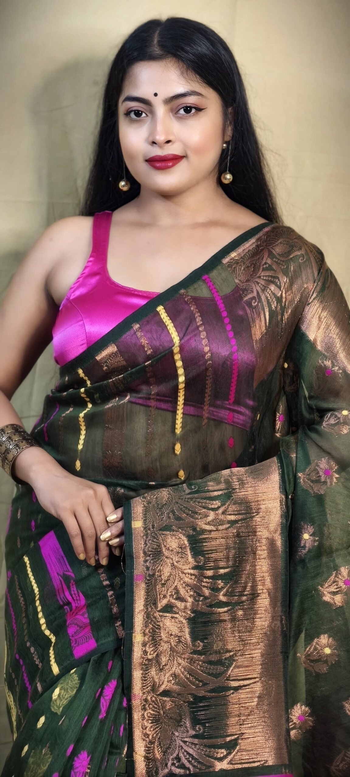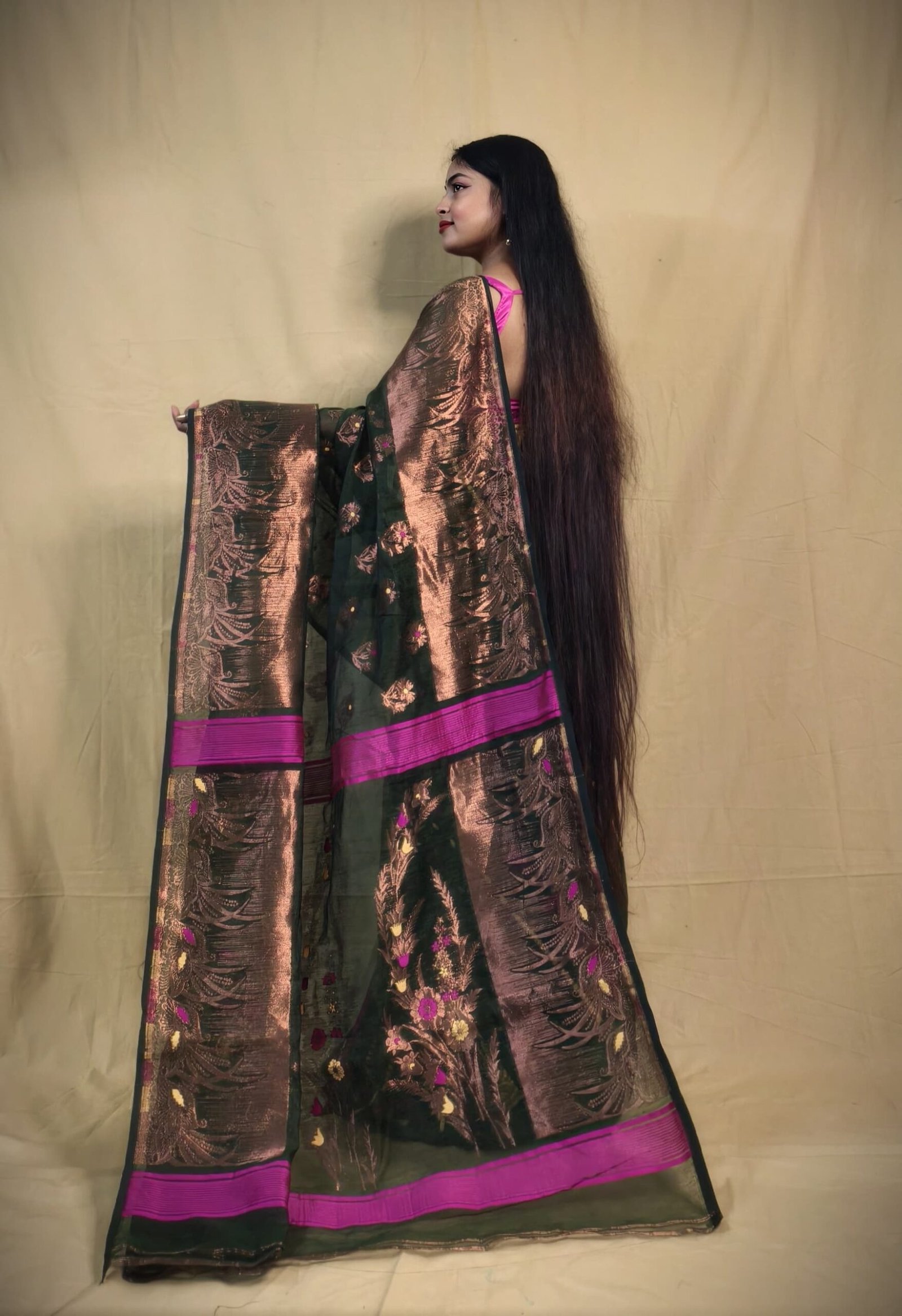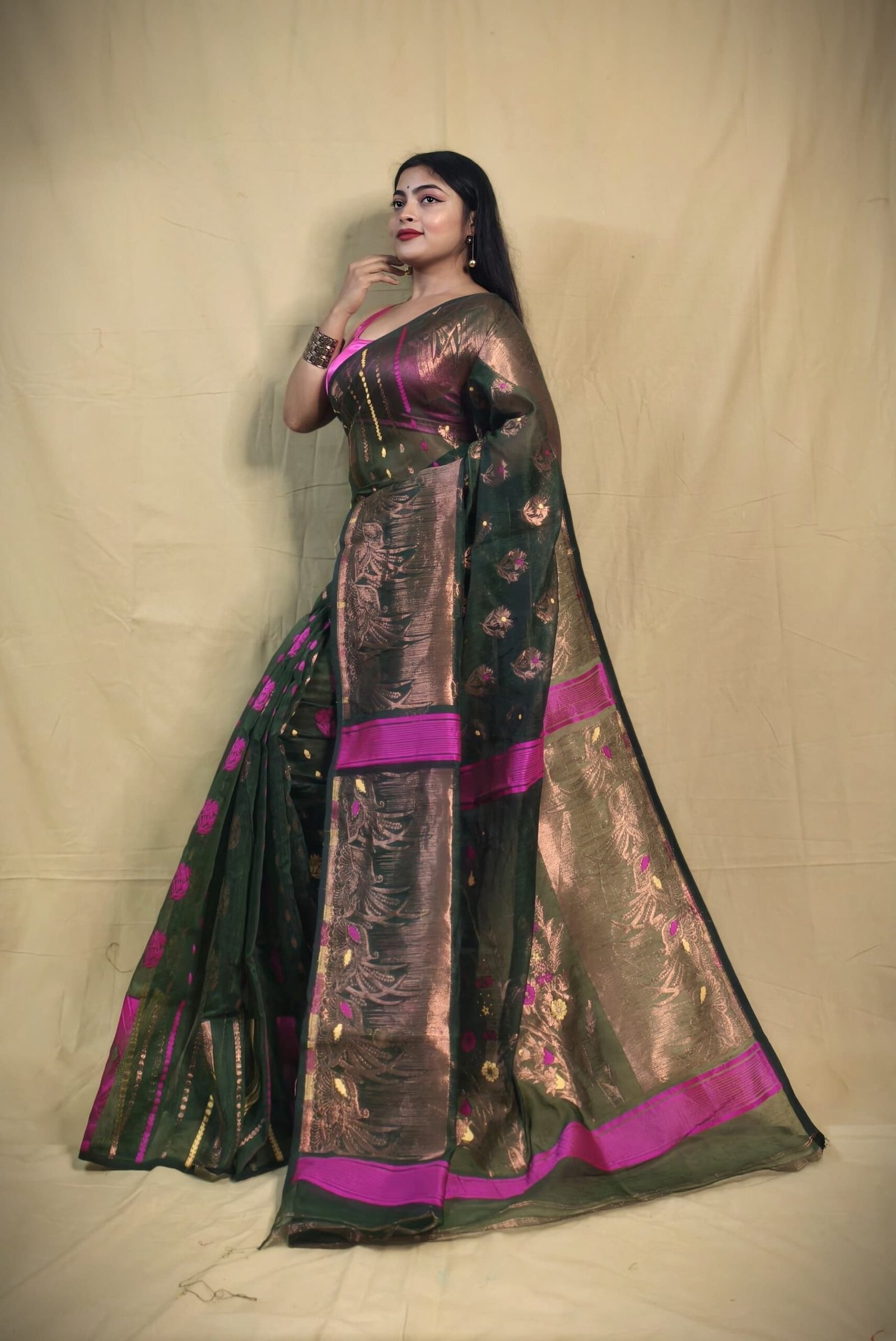 Elegant blended cotton Jamdani saree featuring traditional floral and leafy woven motifs across the body and pallu. Adorned with fine Jamdani weaving and a detailed striped border, the saree showcases expert craftsmanship with a soft and breathable texture. Lightweight and comfortable, it drapes beautifully for festive and casual occasions. Does not include blouse piece.